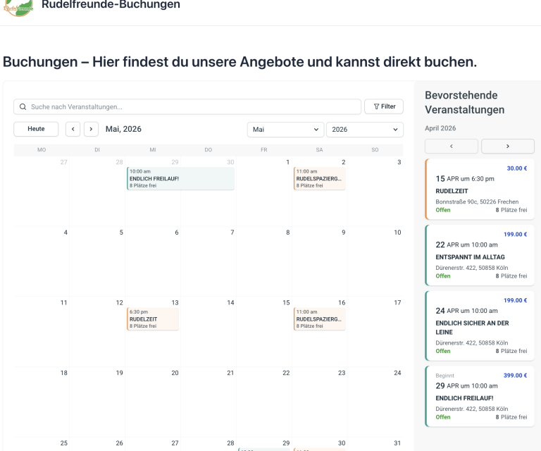 Auf unserer Buchungsseite findest Du eine Übersicht über alle aktuellen Termine. Workshops, Kurse und Veranstaltungen der Rudelfreunde findest Du alle dort und kannst Dir direkt deinen Platz buchen.