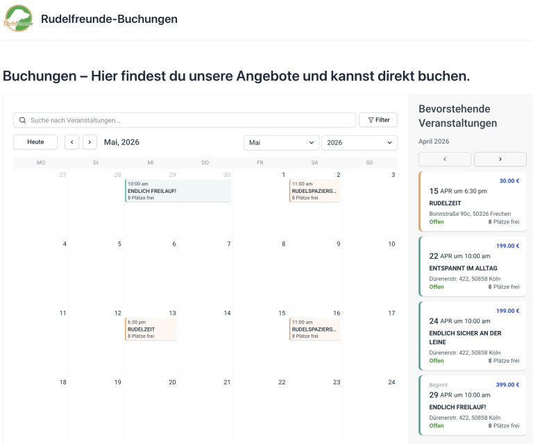 Auf unserer Buchungsseite findest Du eine Übersicht über alle aktuellen Termine. Workshops, Kurse und Veranstaltungen der Rudelfreunde findest Du alle dort und kannst Dir direkt deinen Platz buchen.
